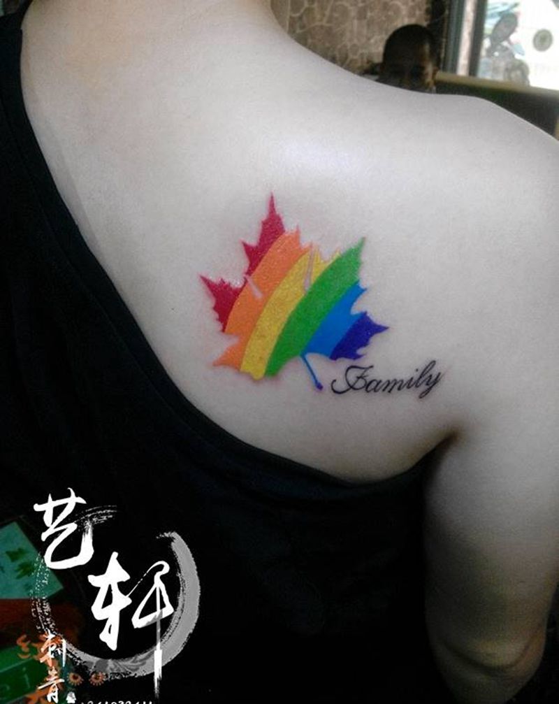 当前位置: 首页 >广东省深圳市纹身店-深圳南山艺轩纹身工作室纹身图案>彩虹枫叶纹身图片_清新背部水彩纹身图案