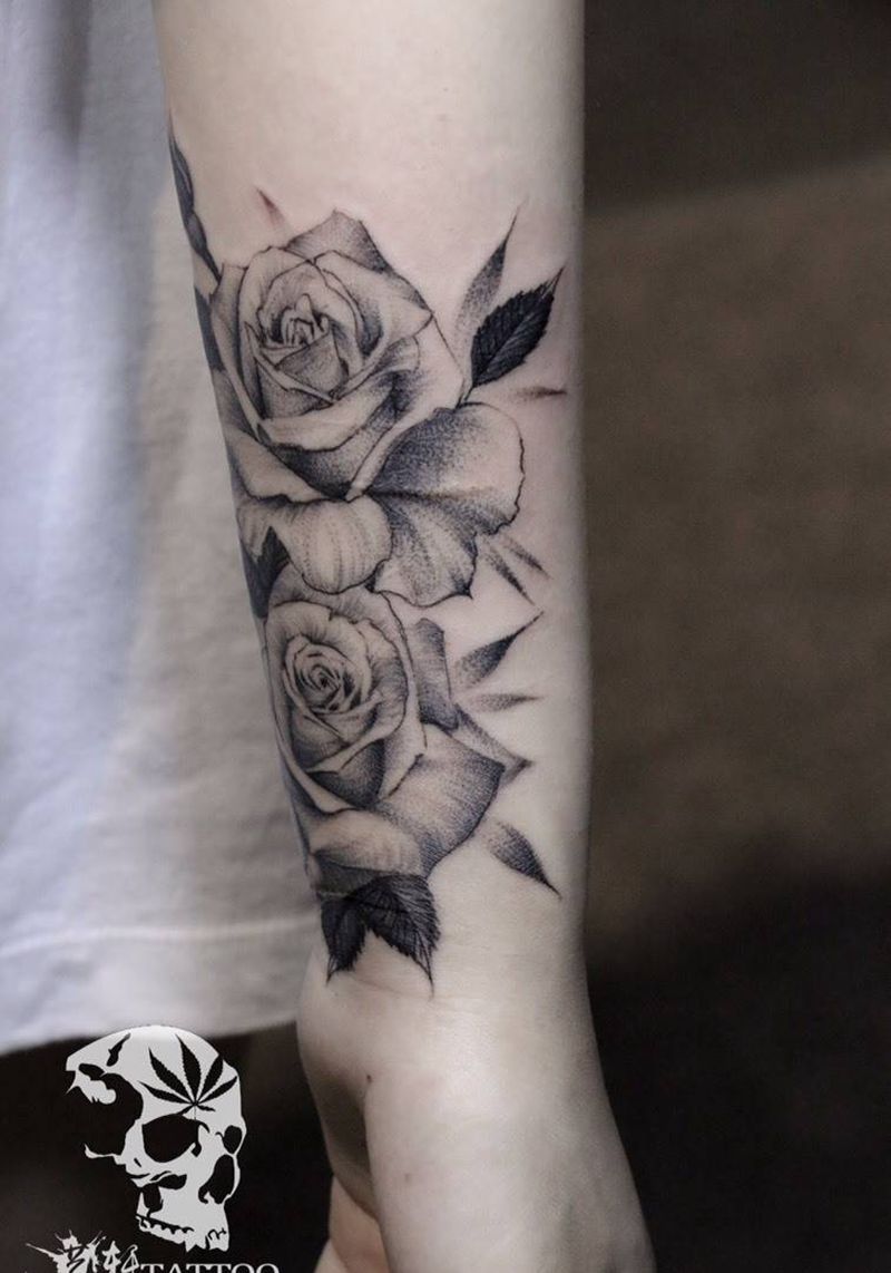 点刺玫瑰纹身图片_成品手部清新静物纹身图案