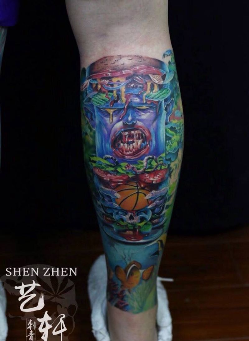 当前位置: 首页 >广东省深圳市纹身店-深圳南山艺轩纹身工作室纹身图案>汉堡怪包小腿纹身图片_成品脚部欧美鬼神欧美写实纹身图案