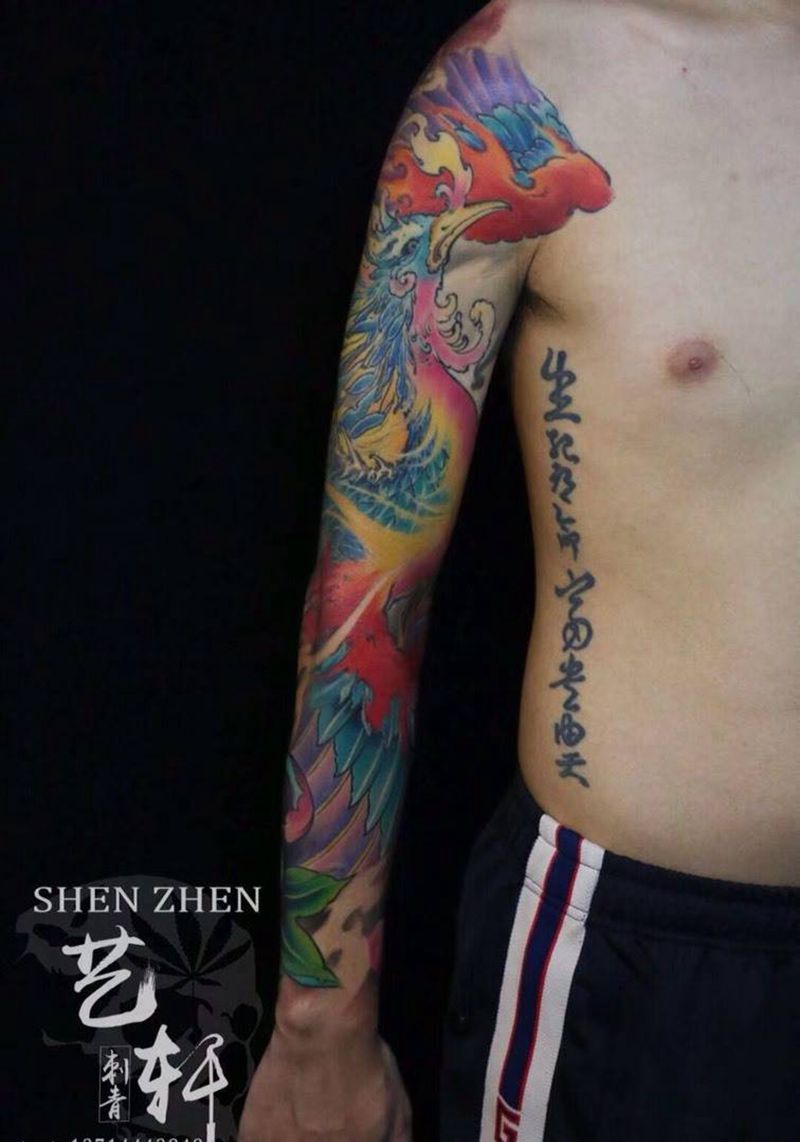 当前位置: 首页 >广东省深圳市纹身店-深圳南山艺轩纹身工作室纹身图案>全彩凤凰花臂纹身图片_成品手臂传统纹身图案
