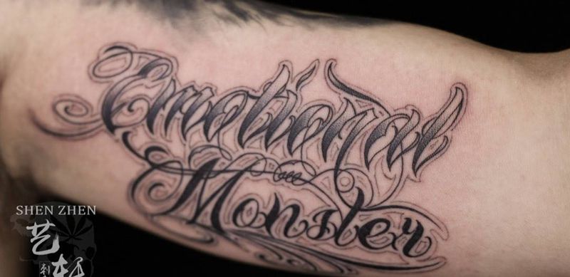当前位置: 首页 >广东省深圳市纹身店-深圳南山艺轩纹身工作室纹身图案>花体字纹身图片_成品手臂传统字符纹身图案
