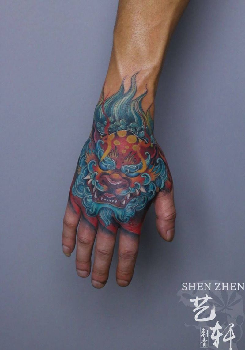 唐狮手背纹身纹身图片_成品手稿手臂手部传统动物静物纹身图案
