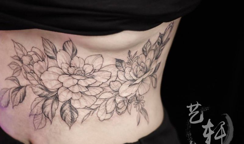 素花遮盖疤痕纹身图片_成品腰部清新植物纹身图案