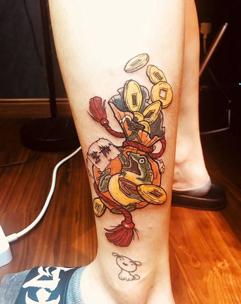 当前位置: 首页 >广东省深圳市纹身店-Carbon组织在召唤纹身图案>招财钱袋纹身图片_成品腿部传统动物鬼神图腾纹身图案