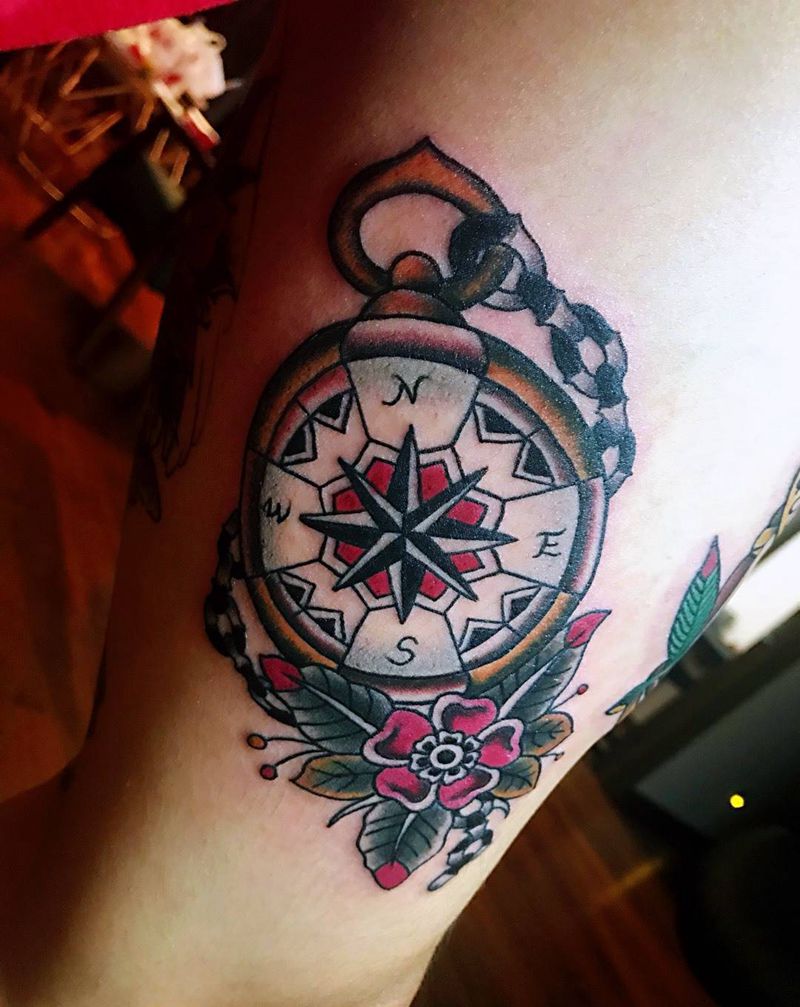 当前位置: 首页 >广东省深圳市纹身店-Carbon组织在召唤纹身图案>指南针 old school纹身图片_腿部Old School指南针纹身图案