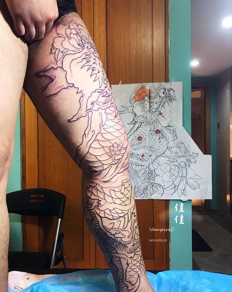 • T网红王老大花腿龙纹身图片_腿部新传统纹身图案