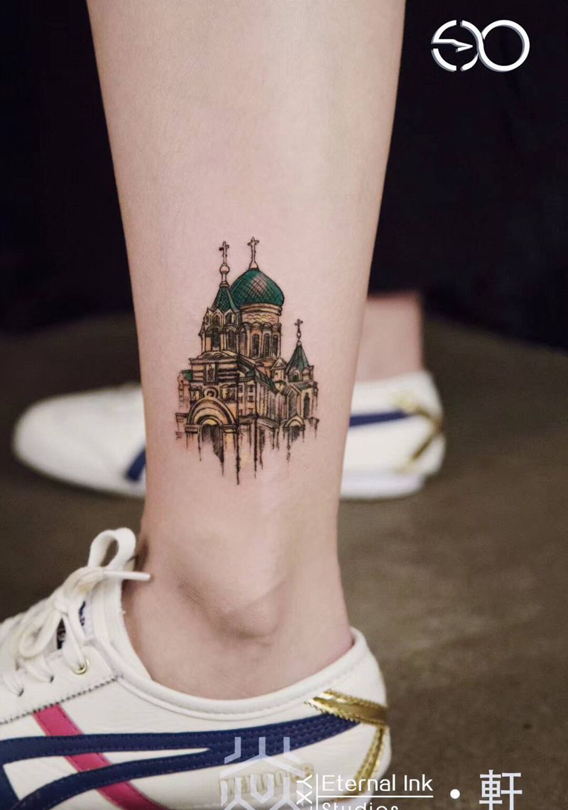 我的家乡纹身图片_脚部腿部水彩水墨教堂纹身图案