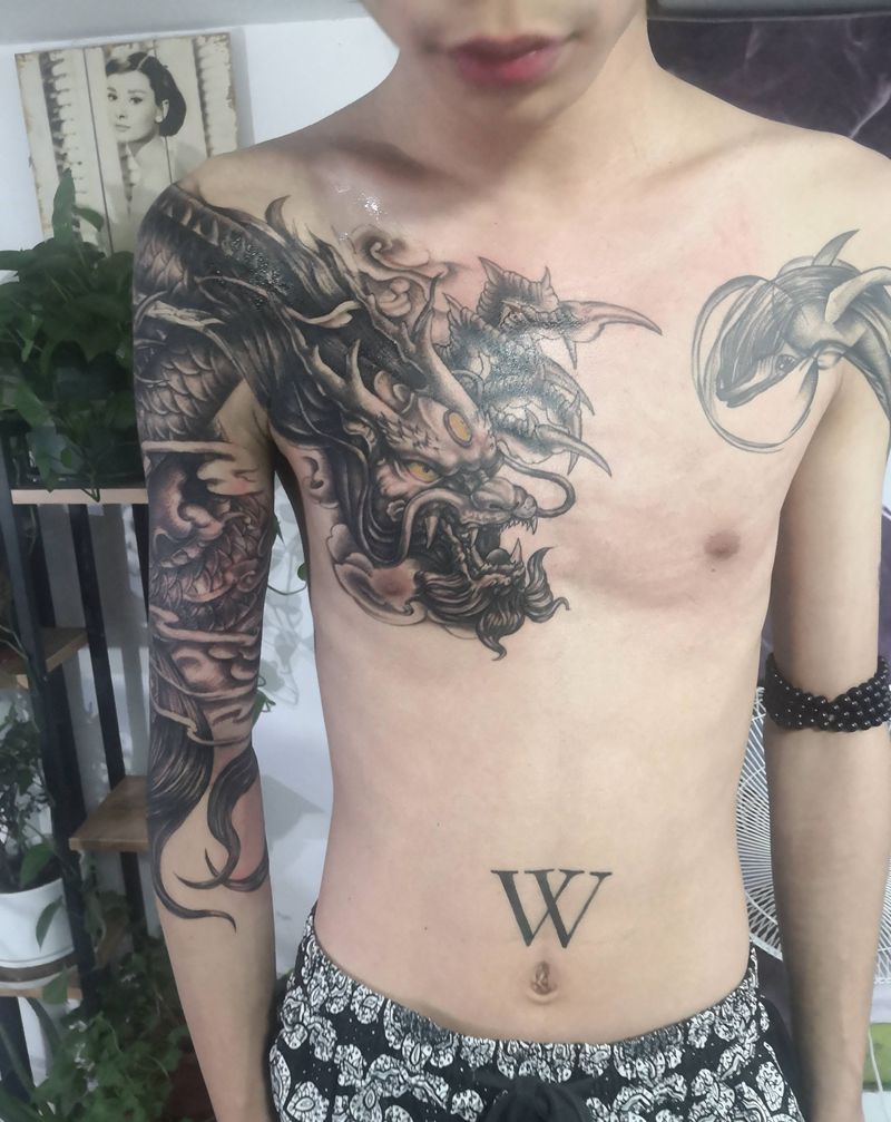 过肩龙纹身图片_手臂新传统纹身图案