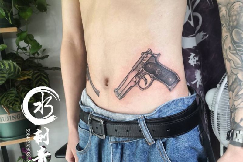 双枪纹身图片_腹部欧美写实纹身图案