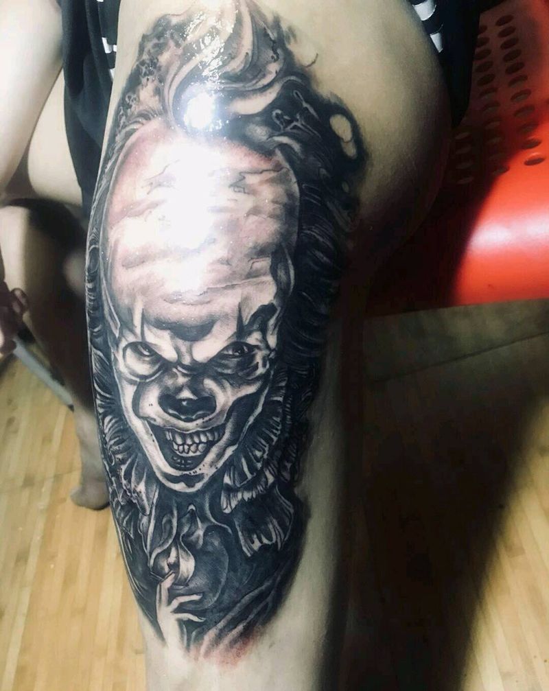 当前位置: 首页 >广东省深圳市纹身店-水刺青纹身图案>小丑纹身图片_腿部欧美人物成品纹身图案