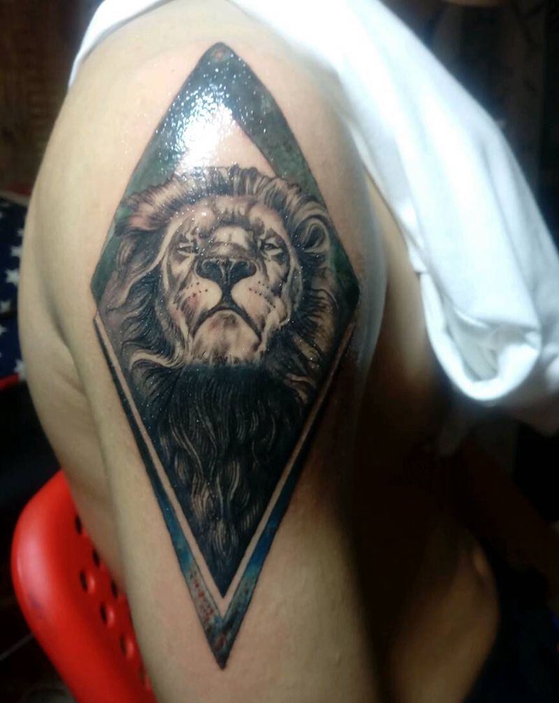 当前位置: 首页 >广东省深圳市纹身店-水刺青纹身图案>雄狮纹身图片_手臂欧美动物成品纹身图案