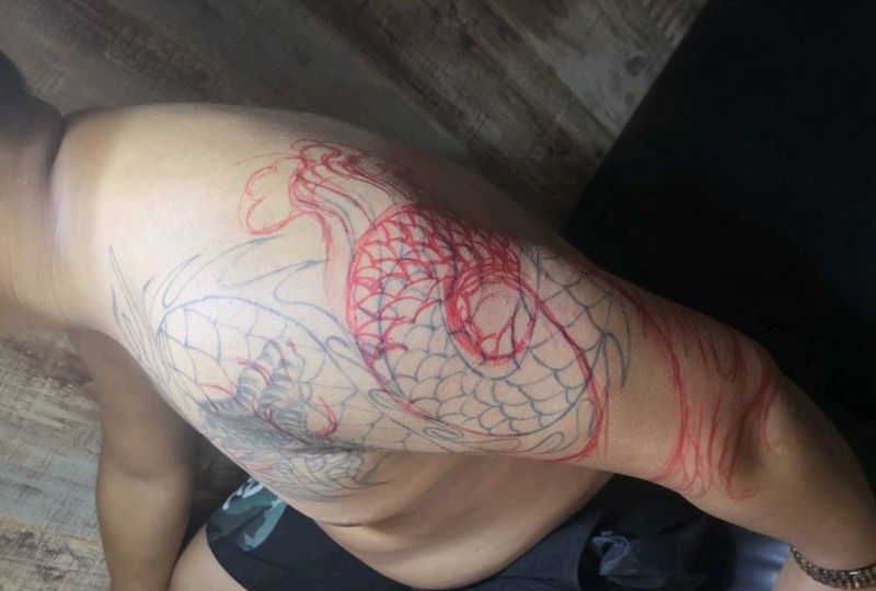 当前位置: 首页 >广东省深圳市纹身店-水刺青纹身图案>过肩龙上色修改纹身图片_手臂老传统纹身图案