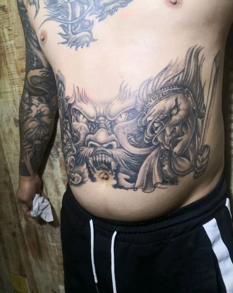 大天黑,龙,白起纹身图片_腹部老传统龙白起大天黑纹身图案