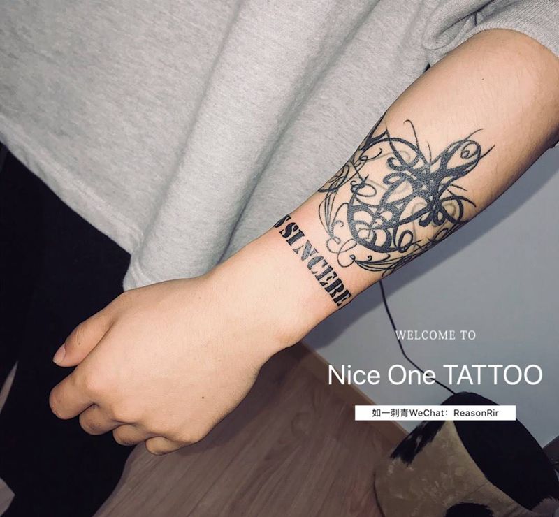 当前位置: 首页 >广东省深圳市纹身店-NiceOne TATTOO纹身图案>真善勇臂环纹身图片_手臂花体字臂环纹身图案