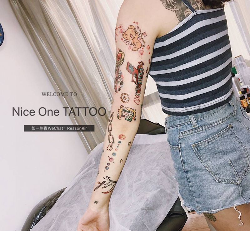 当前位置: 首页 >广东省深圳市纹身店-NiceOne TATTOO纹身图案>少女拼接花臂纹身图片_手臂Old School可爱仙气纹身图案
