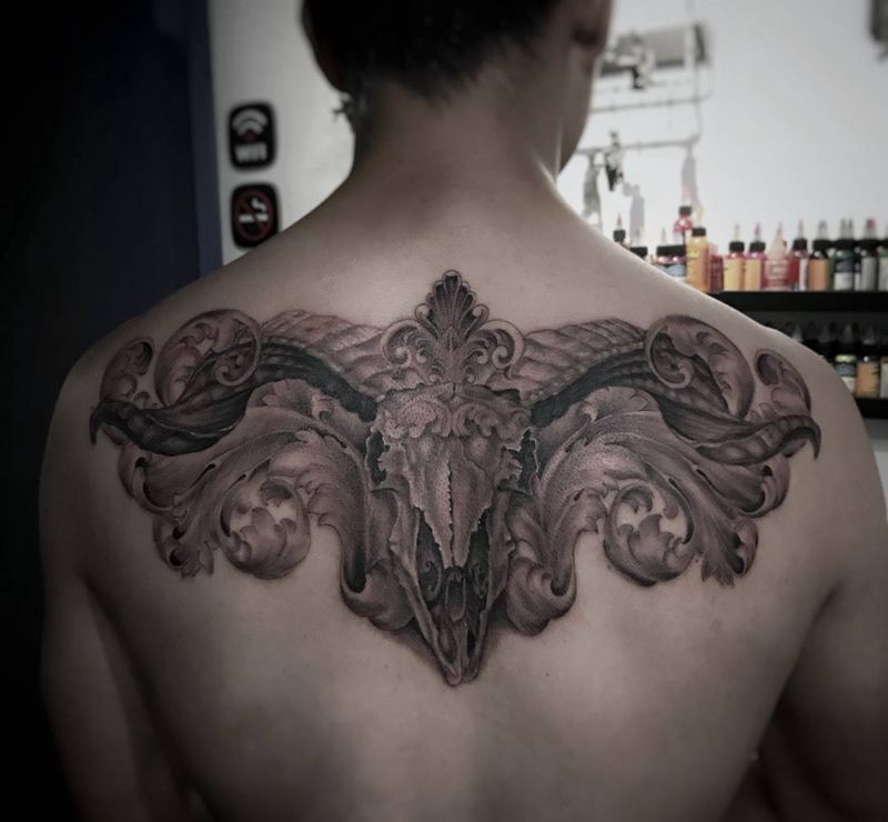 当前位置: 首页 >广东省深圳市纹身店-AT tattoo studio纹身图案>羊头纹身图片_成品背部胸部腿部手臂欧美写实肖像人物动物纹身图案