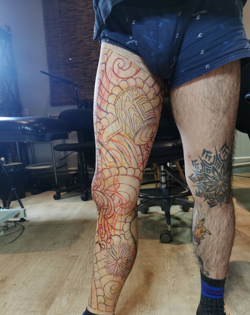 当前位置: 首页 >广东省深圳市纹身店-墨印纹身工作室纹身图案>手绘花腿纹身图片_腿部老传统花腿纹身图案