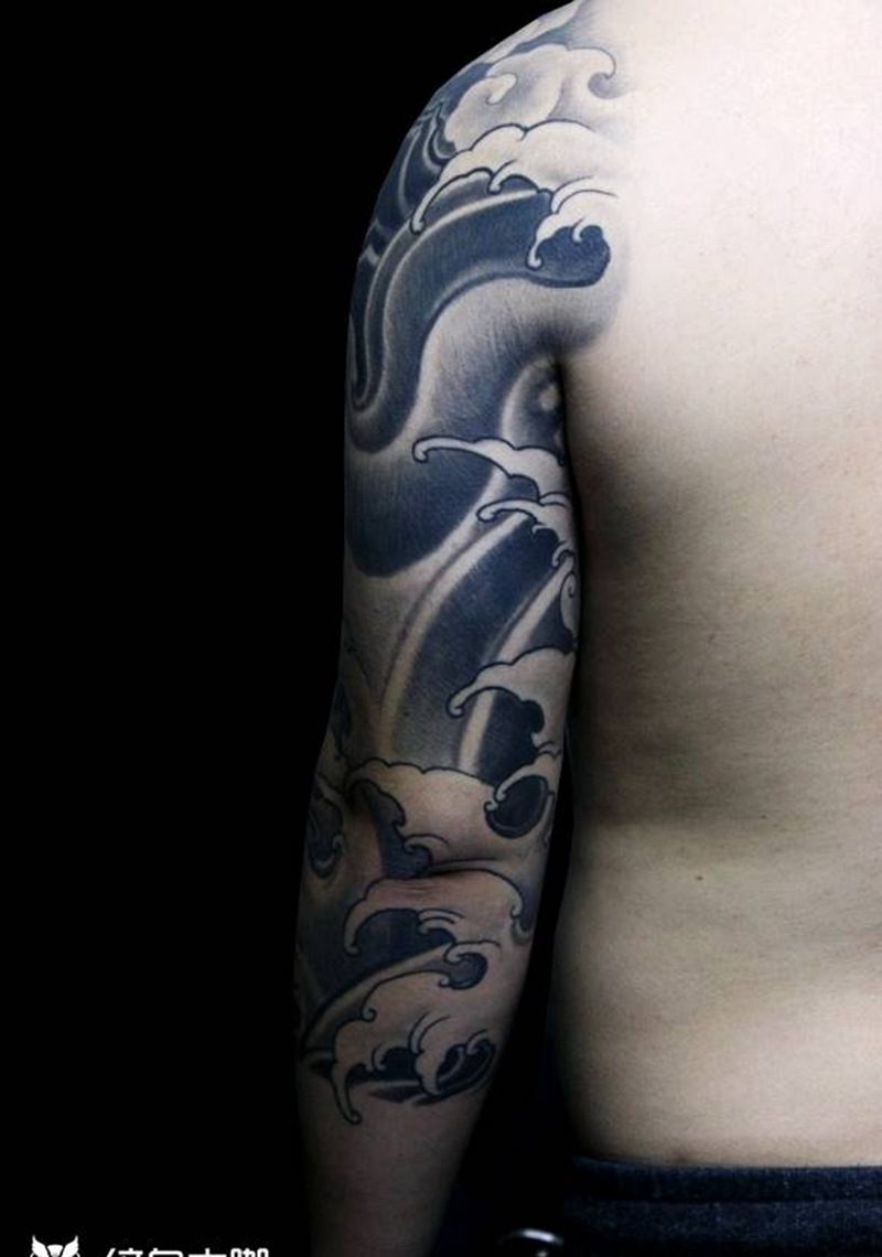 花臂水浪纹身图片_手臂手部新传统老传统七分袖花臂水浪纹身图案