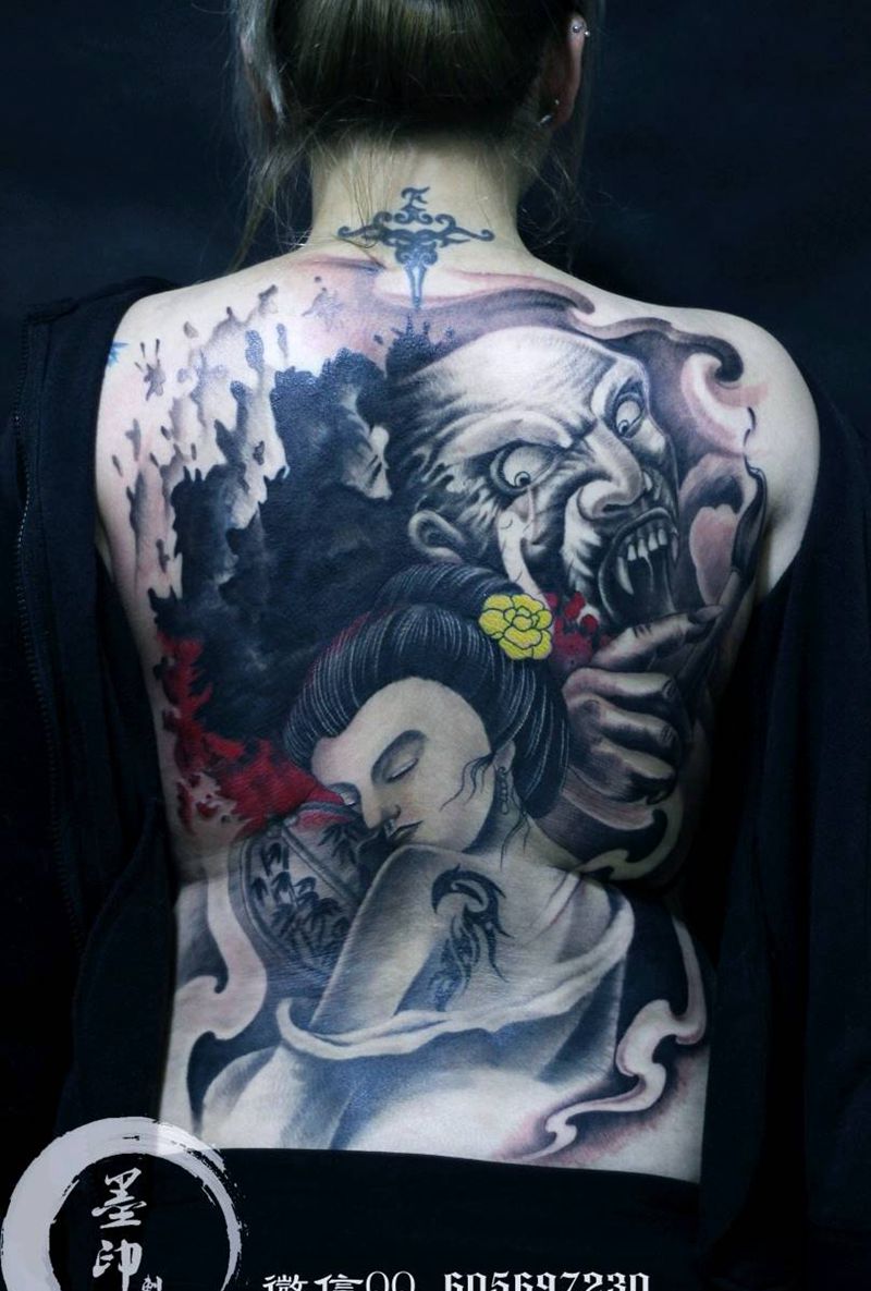 黑灰满背纹身图案