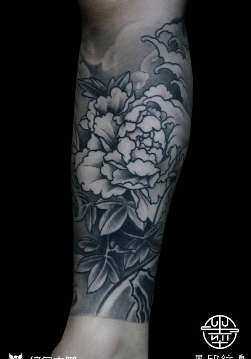 当前位置: 首页 >广东省深圳市纹身店-墨印纹身工作室纹身图案>包小腿纹身图片_腿部脚部新传统水浪牡丹纹身图案
