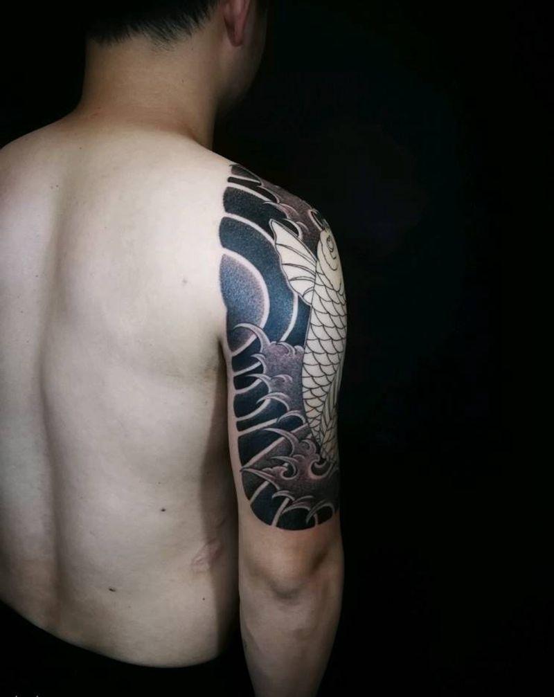 日式半甲 未完成纹身图片_肩部手臂老传统新传统半甲鲤鱼日式半甲纹身图案