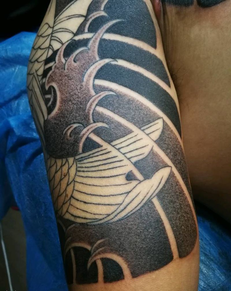 日式半甲 未完成纹身图片_肩部手臂老传统新传统半甲鲤鱼日式半甲纹身图案