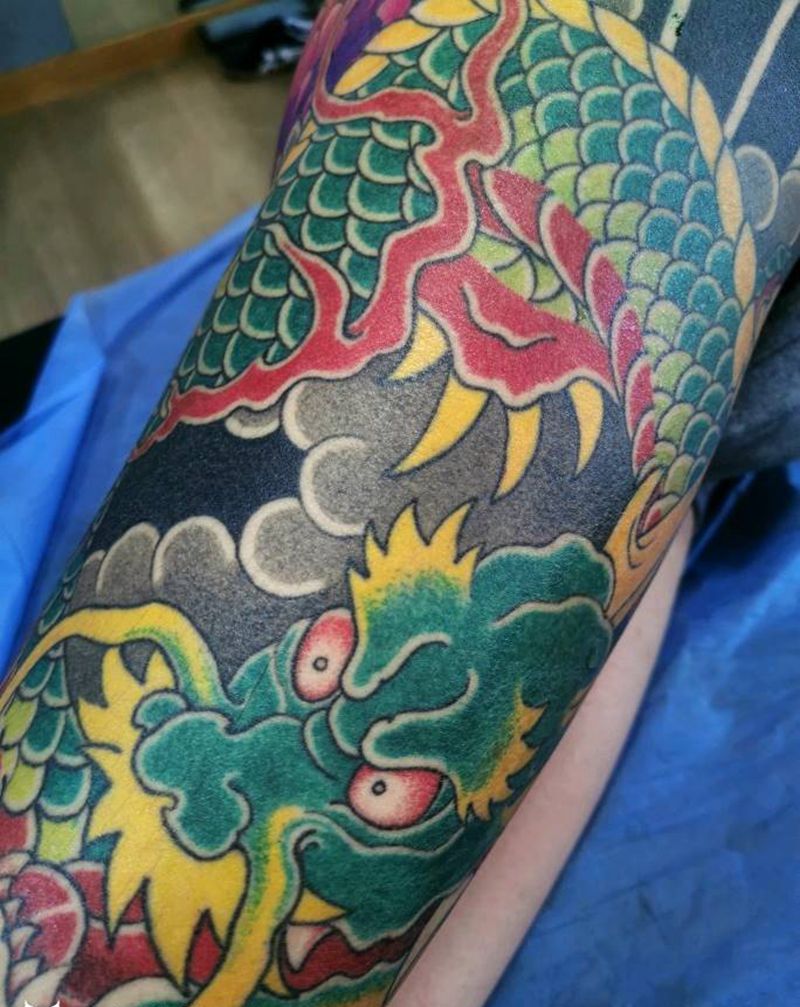 • T网红王老大花腿龙纹身图片_腿部新传统纹身图案