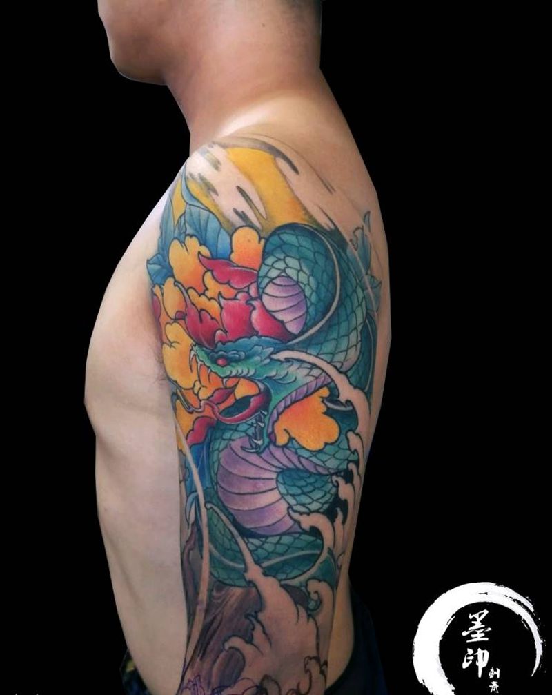 • T网红王老大花腿龙纹身图片_腿部新传统纹身图案
