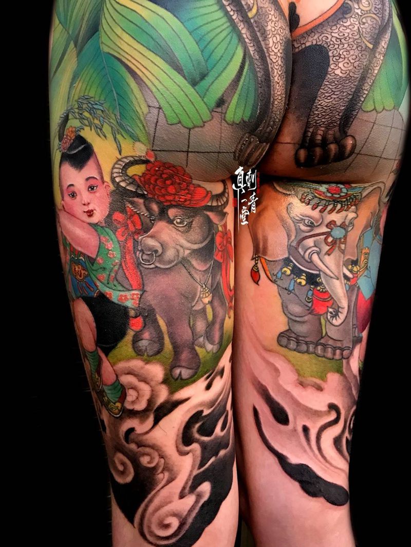 • T网红王老大花腿龙纹身图片_腿部新传统纹身图案