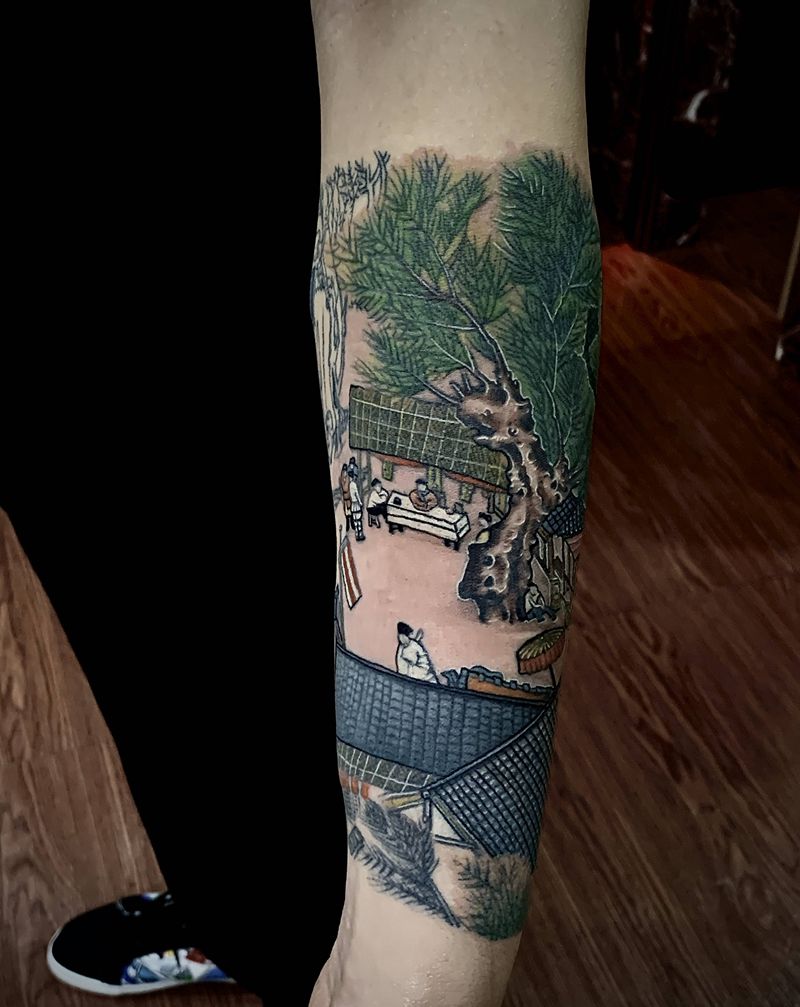 清明上河图纹身图片_手臂水墨纹身图案