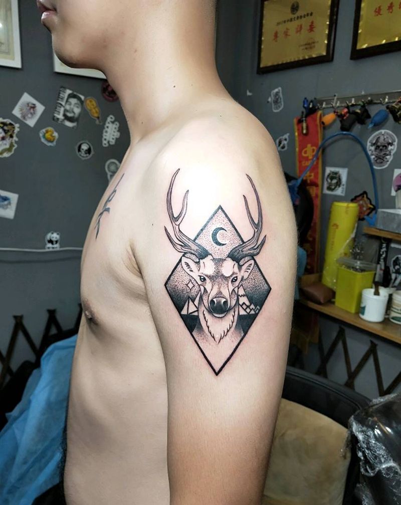 当前位置: 首页 >广东省深圳市纹身店-天羽刺青纹身图案>鹿纹身图片_手臂几何点刺纹身图案