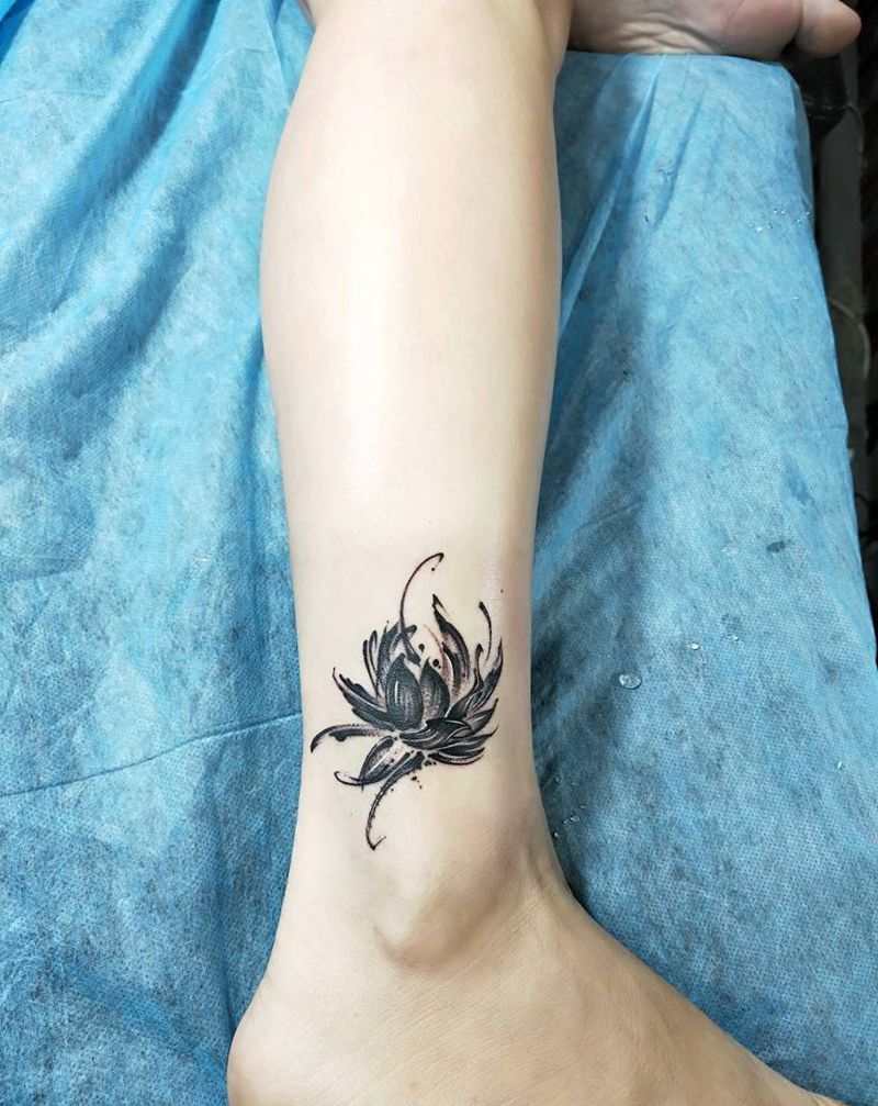 水墨花纹身图片_腿部水墨纹身图案