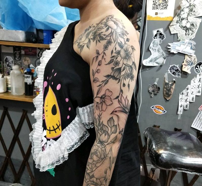 素花花臂纹身图片_手臂手部点刺纹身图案