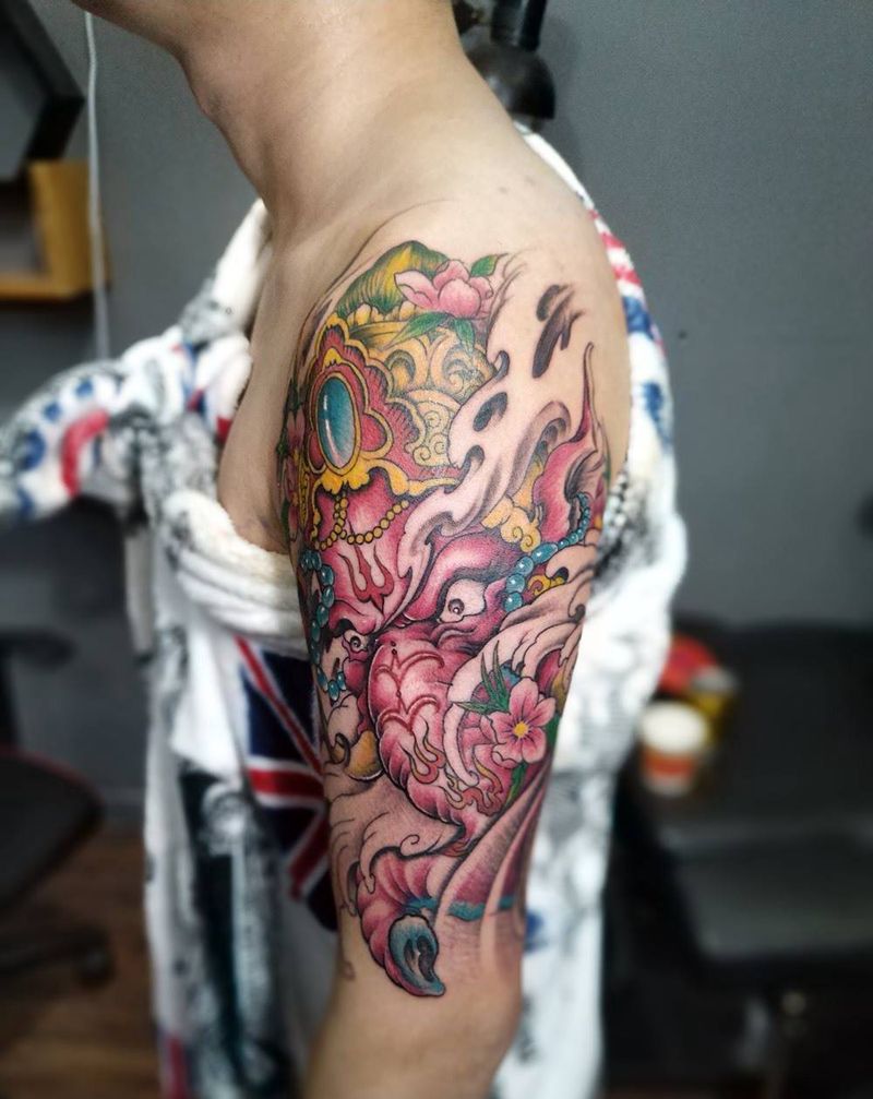 当前位置: 首页 >广东省深圳市纹身店-天羽刺青纹身图案>象神加艺妓花臂未完纹身图片