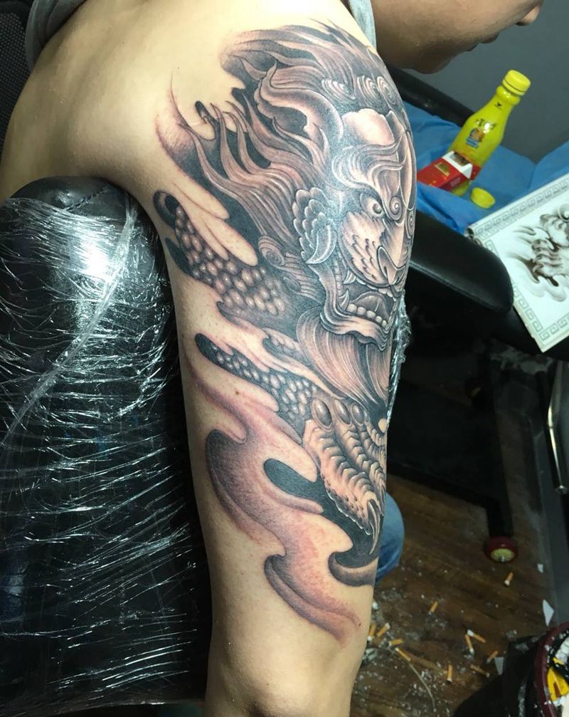 • T网红王老大花腿龙纹身图片_腿部新传统纹身图案