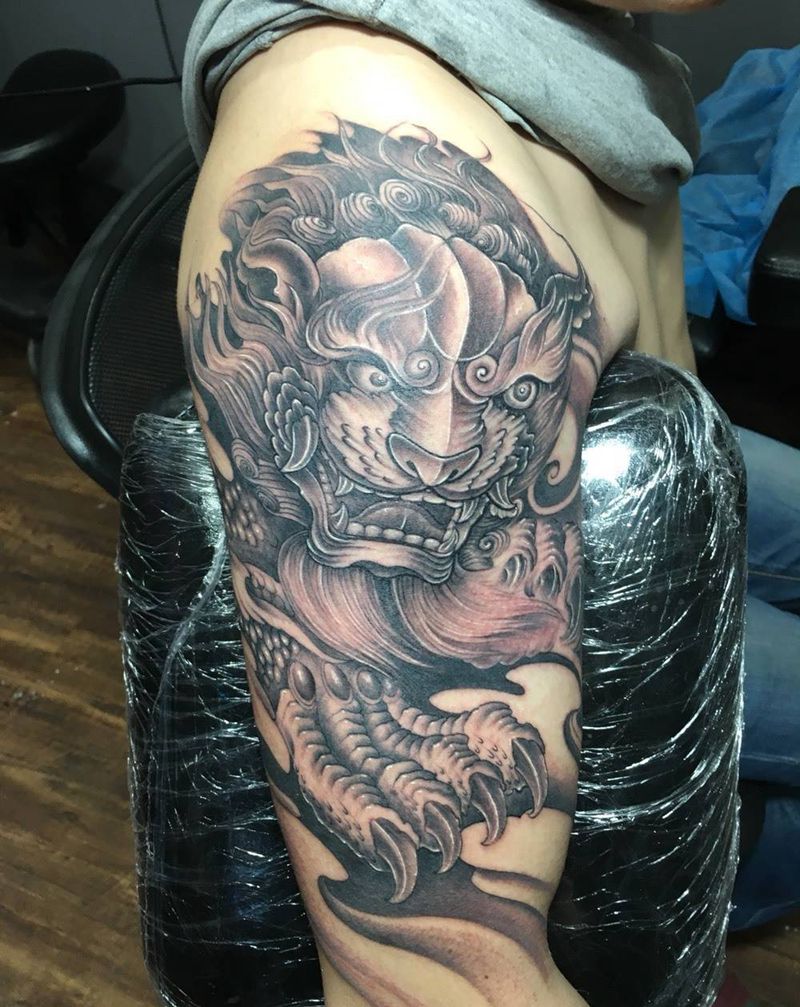 当前位置: 首页 >广东省深圳市纹身店-天羽刺青纹身图案>福狮-招财纳福纹身图片