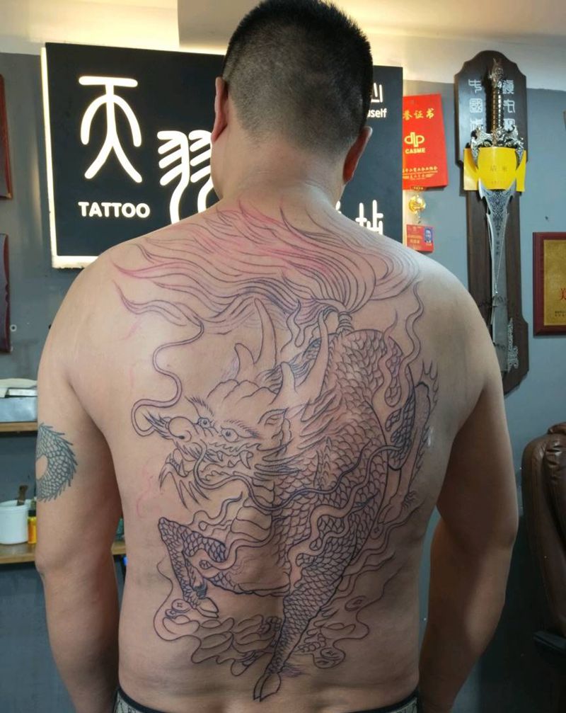 当前位置: 首页 >广东省深圳市纹身店-天羽刺青纹身图案>满背麒麟线条未完成纹身图片