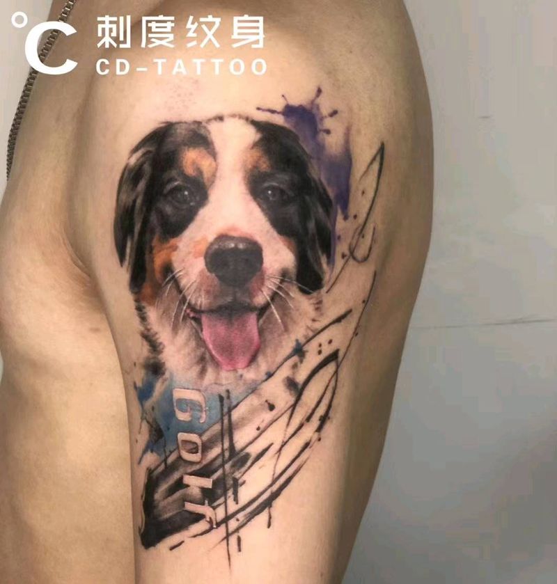 伯恩山犬纹身图片_手臂欧美写实水墨纹身图案