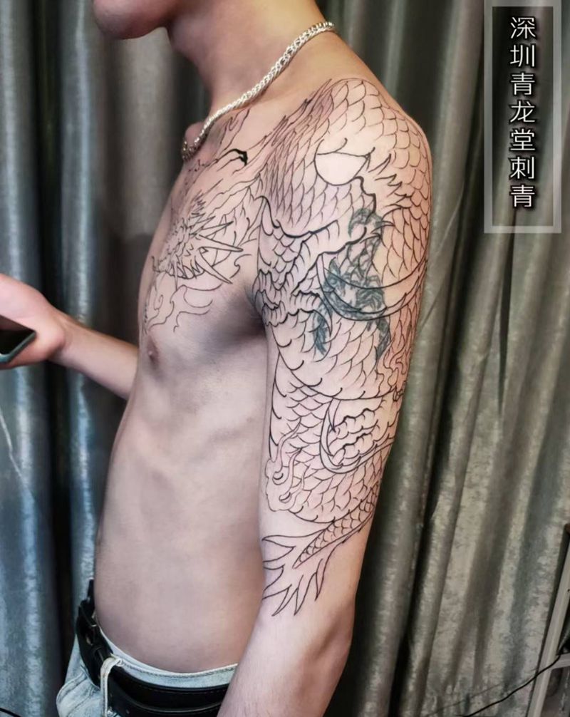当前位置: 首页 >广东省深圳市纹身店-深圳青龙堂纹身工作室纹身图案>过肩龙未完纹身图片_手部胸部新传统纹身图案