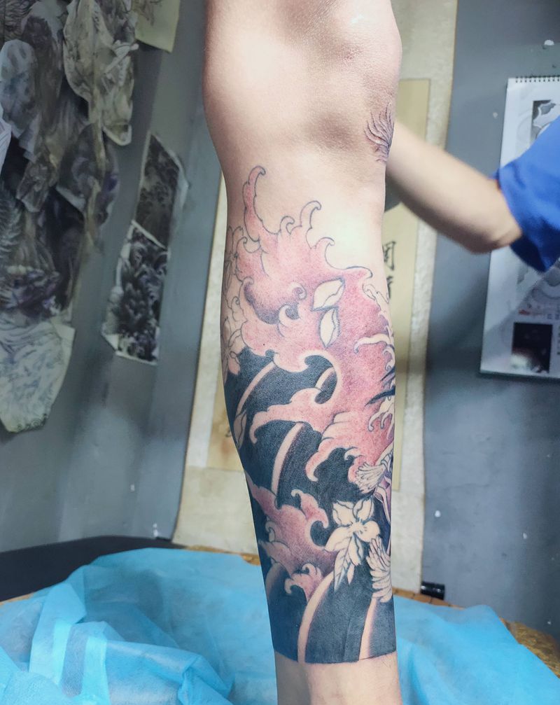 • T网红王老大花腿龙纹身图片_腿部新传统纹身图案