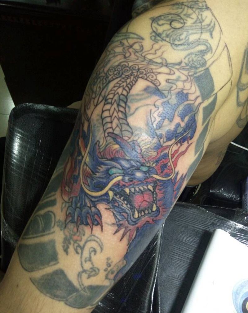 • T网红王老大花腿龙纹身图片_腿部新传统纹身图案