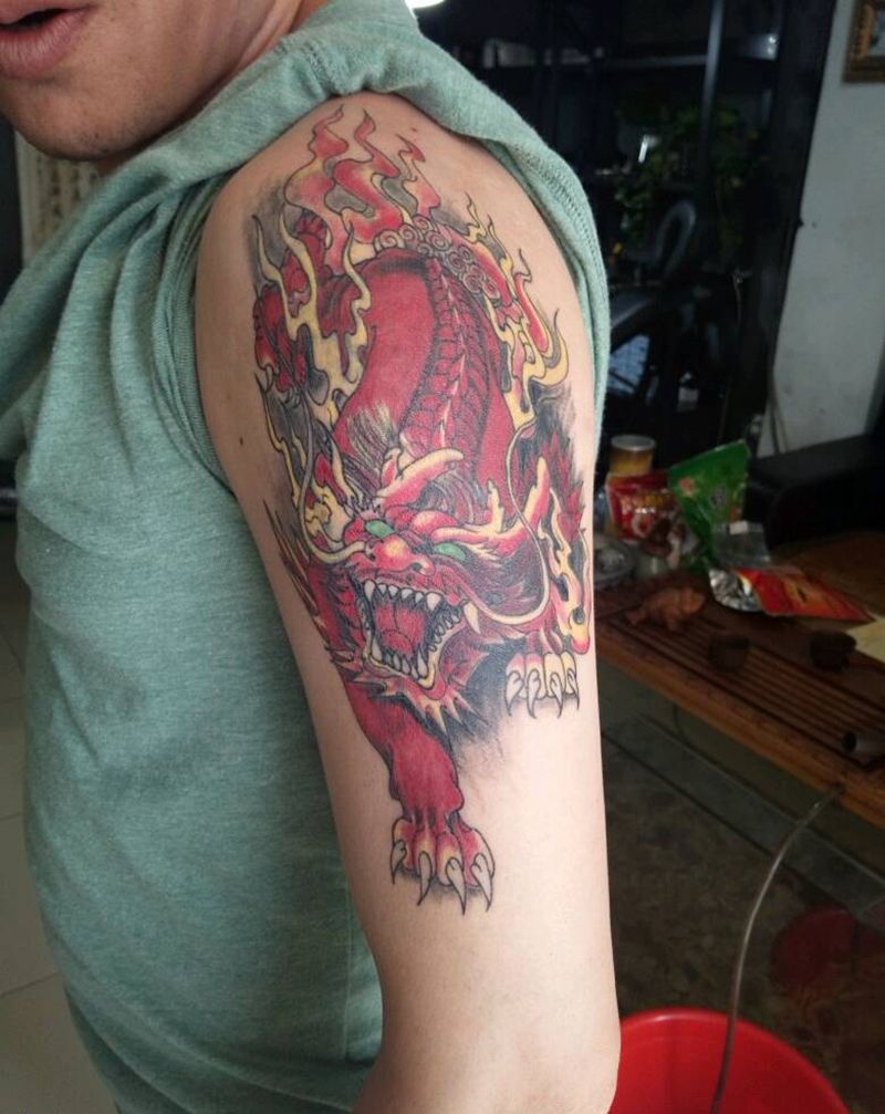 • T网红王老大花腿龙纹身图片_腿部新传统纹身图案