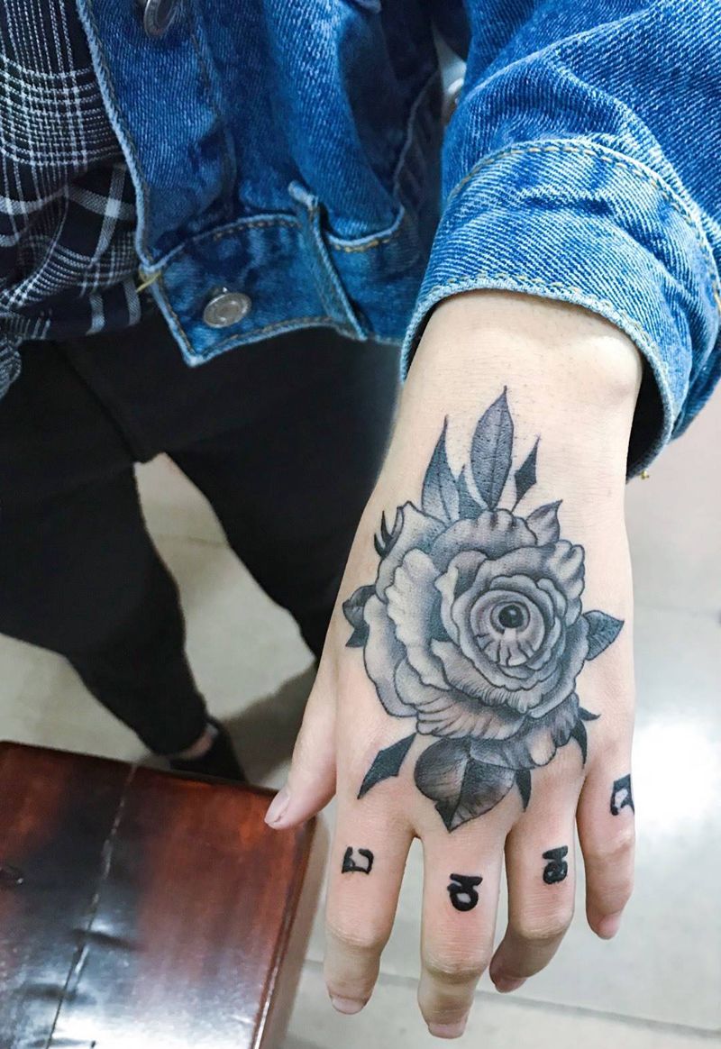 • 手背潮流时尚的玫瑰花眼睛纹身图案