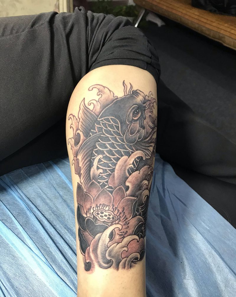 男士腿部鲤鱼纹身图片_腿部老传统纹身图案
