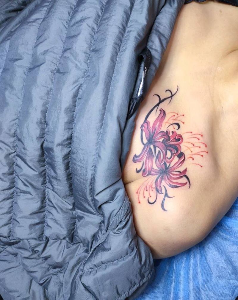 女士锁骨部位彼岸花纹身图片_胸部腰部新传统纹身图案