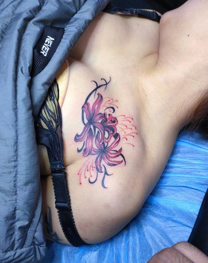 女士锁骨部位彼岸花纹身图片_胸部腰部新传统纹身图案