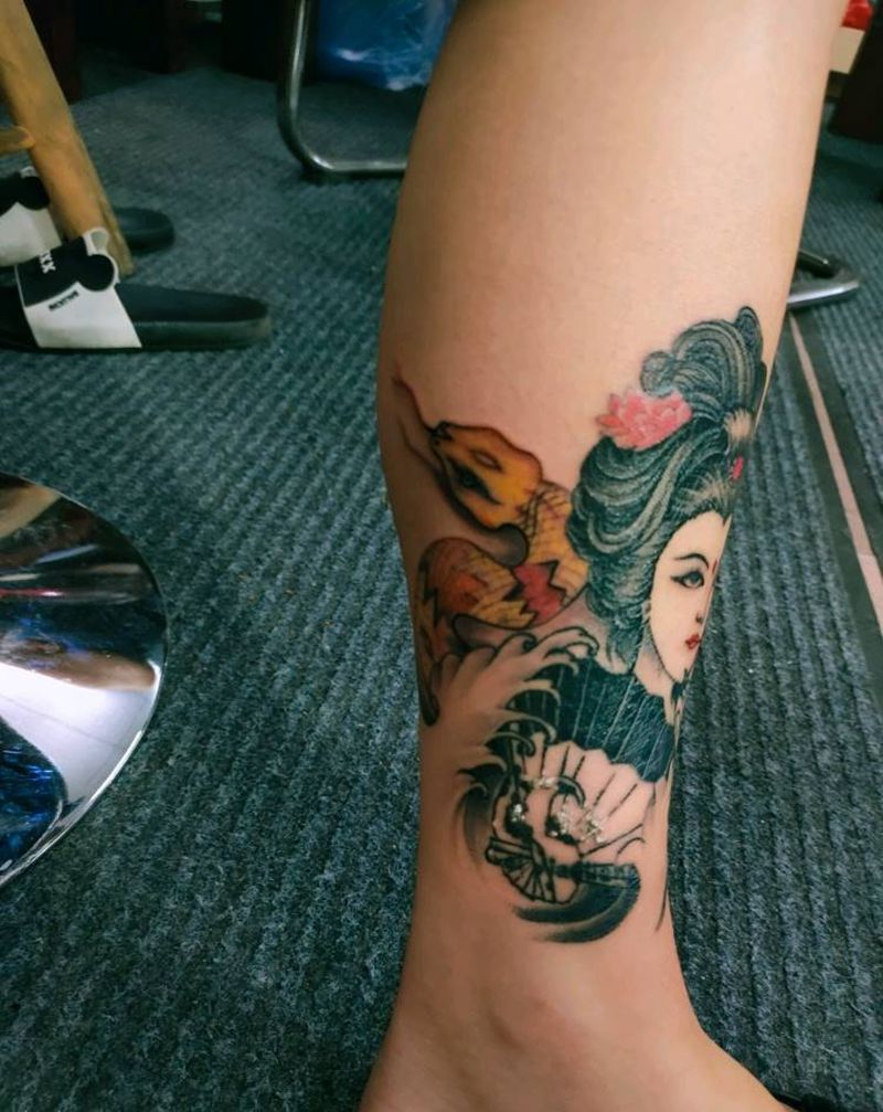 女士,小腿艺伎纹身图片_脚部新传统纹身图案