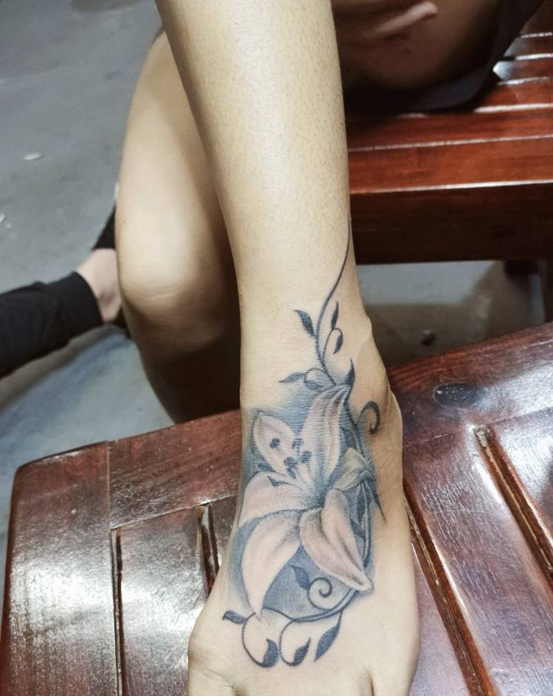 女士脚背上百合花纹身图片_脚部新传统纹身图案