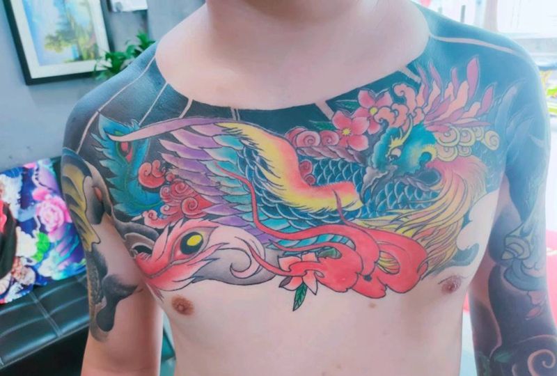 花胸(彩色凤凰)恢复后的效果纹身图片_胸部新传统纹身图案