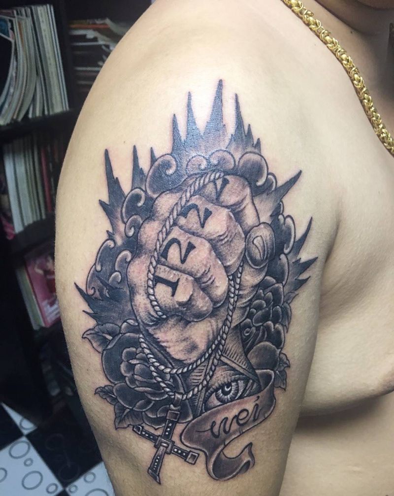 当前位置: 首页 >广东省深圳市纹身店-名海刺青纹身图案>拳头纹身图片_手臂老传统纹身图案